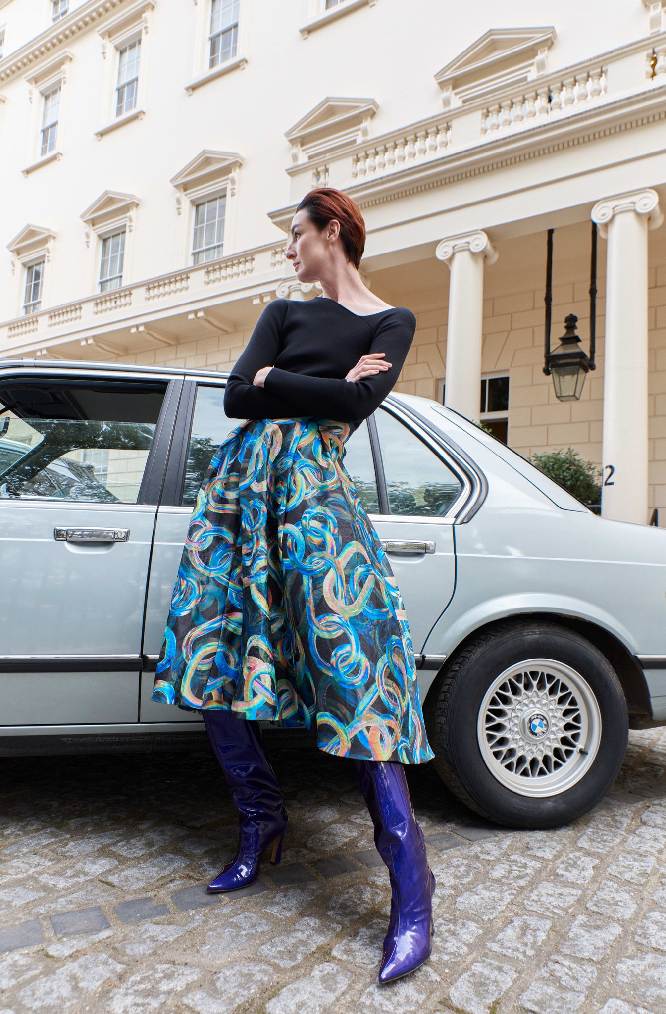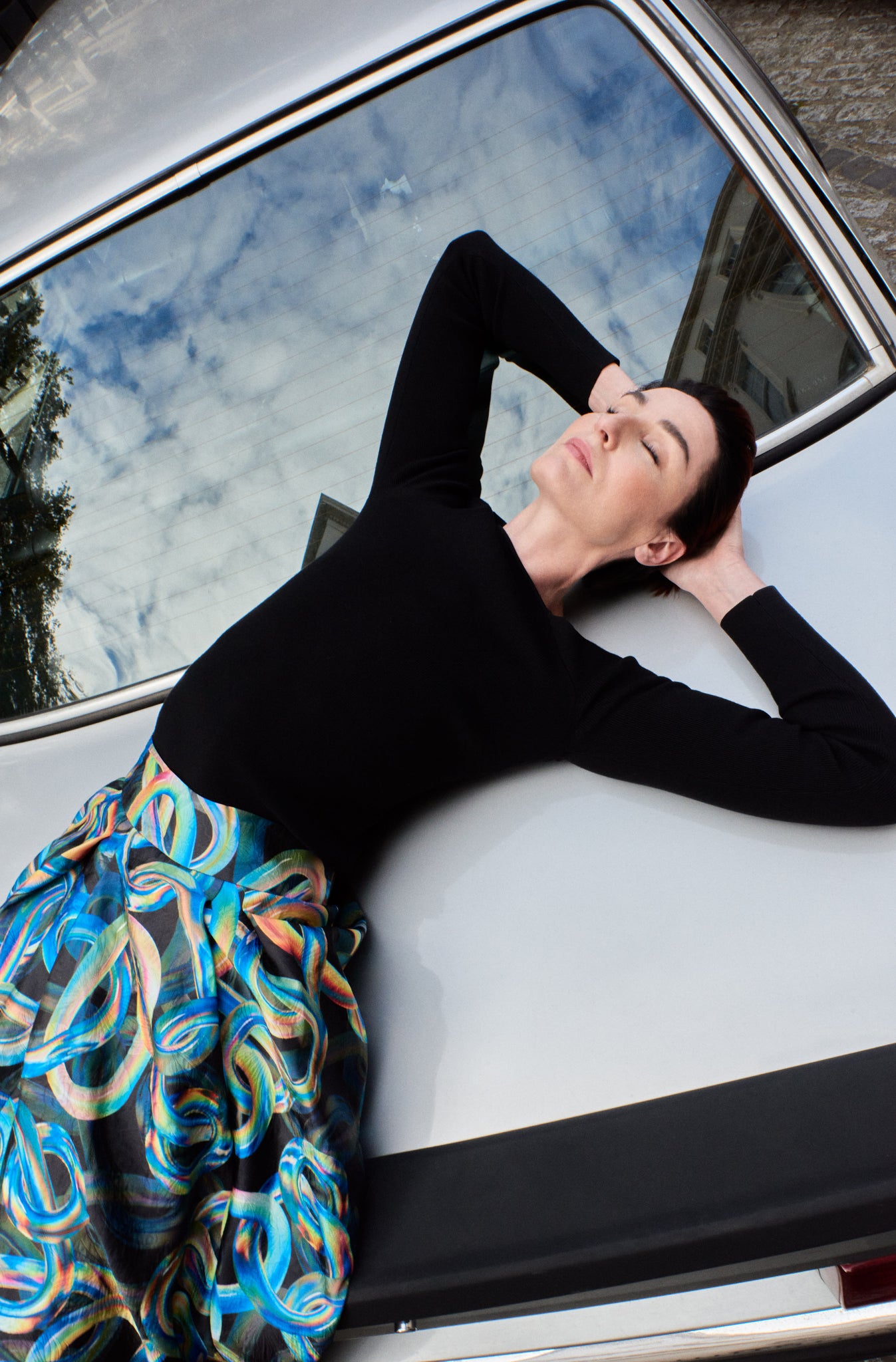 Sweater is finely ribbed for a close, flattering fit that's ideal for tucking into high-waisted bottoms. The elegant piece drapes off the left shoulder thanks to the asymmetrically cut neckline.